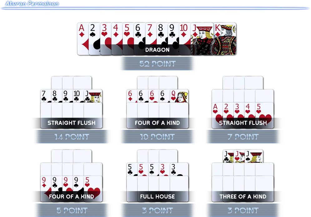 Contoh kartu Dragon: 2, 3, 4, 5, 6, 7, 8, 9, 10, J, Q, K, A (13 kartu pada “tangan” anda).